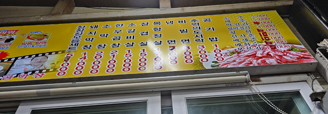 메뉴는 딱 있을 것만 있는데요! 돼지막창, 소막창, 한우곱창이 함께 나오는 창창창모듬세트와 소갈비살, 삼겹살 등이 있습니다.